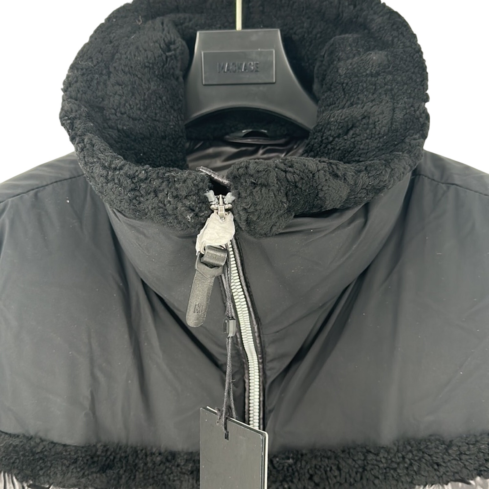 MIYA is a lustrous light down jacket for women with a shearling-lined stand collar. Shearling trim detail across the chest and sleeve hems adds plush warmth. Water resistant and repellent, it features insulated zip pockets at the waist. A forward winter piece with tactical protection.