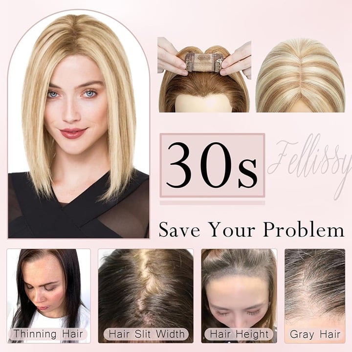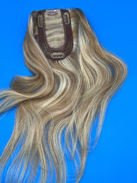 FELLISSY: 14" Blonde tones Human Hair Topper. Real Human Hair with No Bangs Toppers Hair Pieces for Thinning Hair 14 Inch #12P613 Flax Yellow mixed Light Gold. ORIGINAL RETAIL PRICE: $120