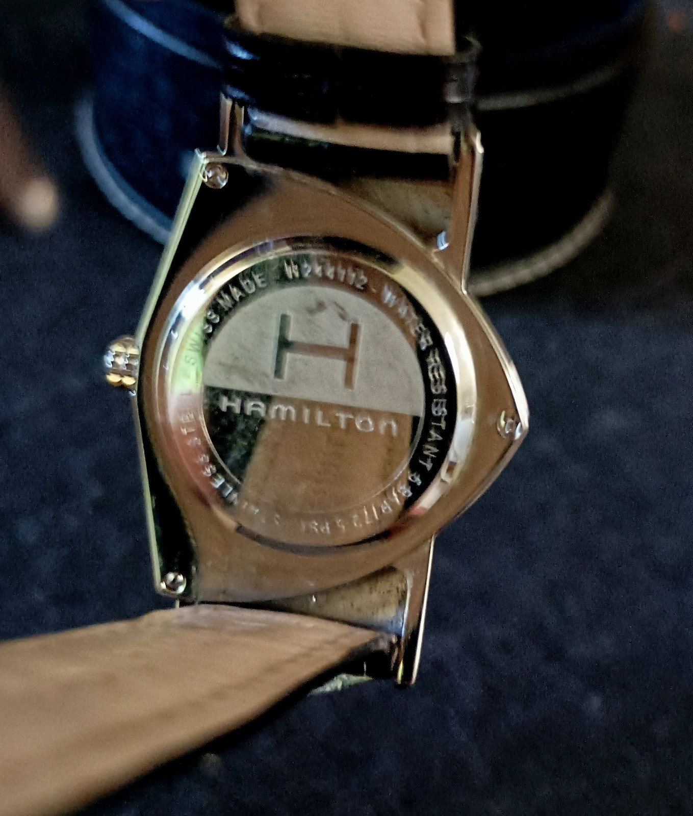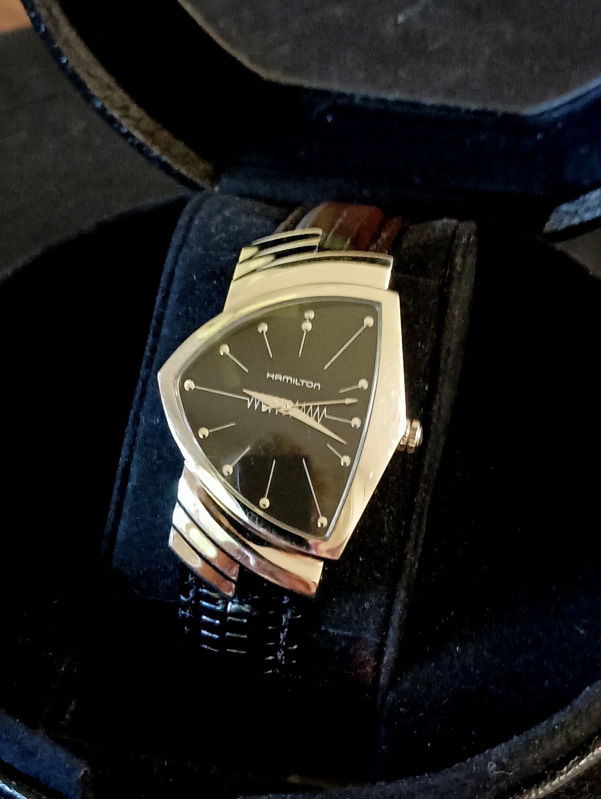 Men's Hamilton Ventura Watch, featuring Stainless Steel Angled Bezel with Black Face, Original Black leather adjustable, deployment strap ( fits wrist up to 7.5"). Swiss made Quartz Movement, Water Resistant 5 Bar 72.5 PSI. H244112. Pre-owned in nice condition, please LOOK at ALL photos! It is used, may have a minor imperfection, not brand new. Arrives in a Hamilton Textured Black Round Watch Box. Very Handsome piece.